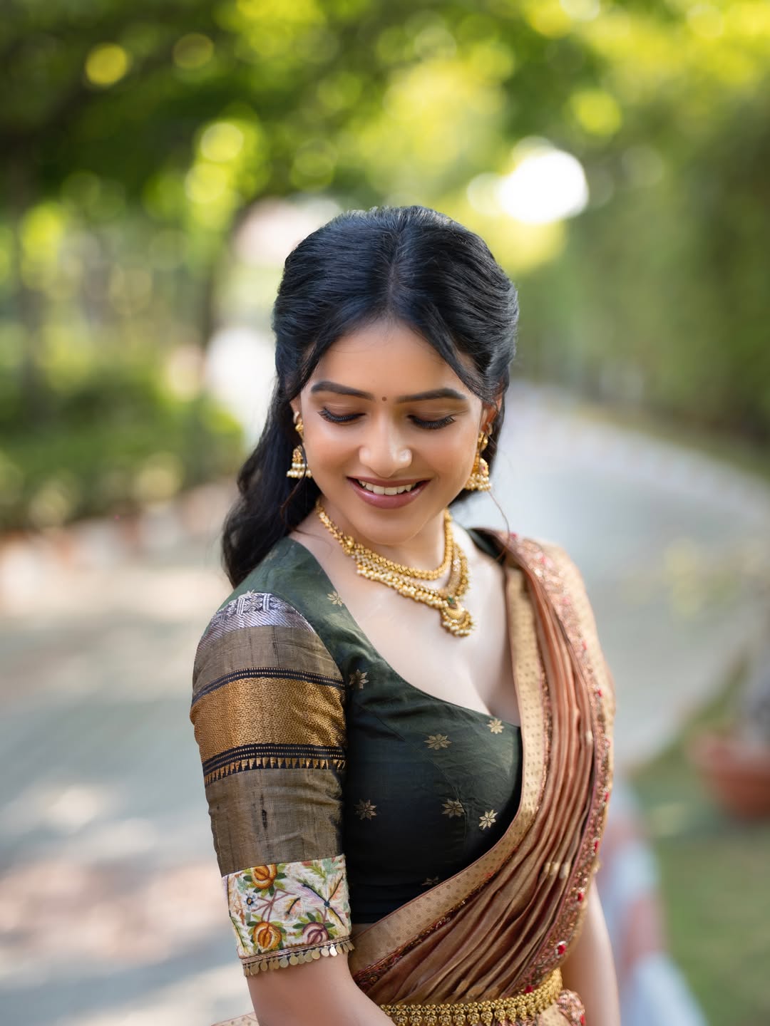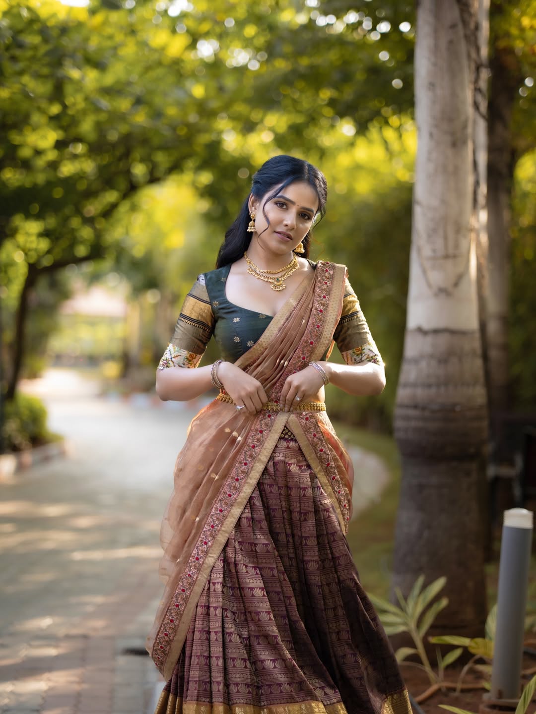 What truly sets Vaishnavi apart is her ability to blend simplicity with sophistication. Whether it’s a traditional look, like the graceful ethnic attire seen in this serene outdoor setting, or a contemporary role on screen, she carries every appearance with confidence and poise. Her expressive eyes and warm smile add depth to her performances, making her instantly likable and relatable.