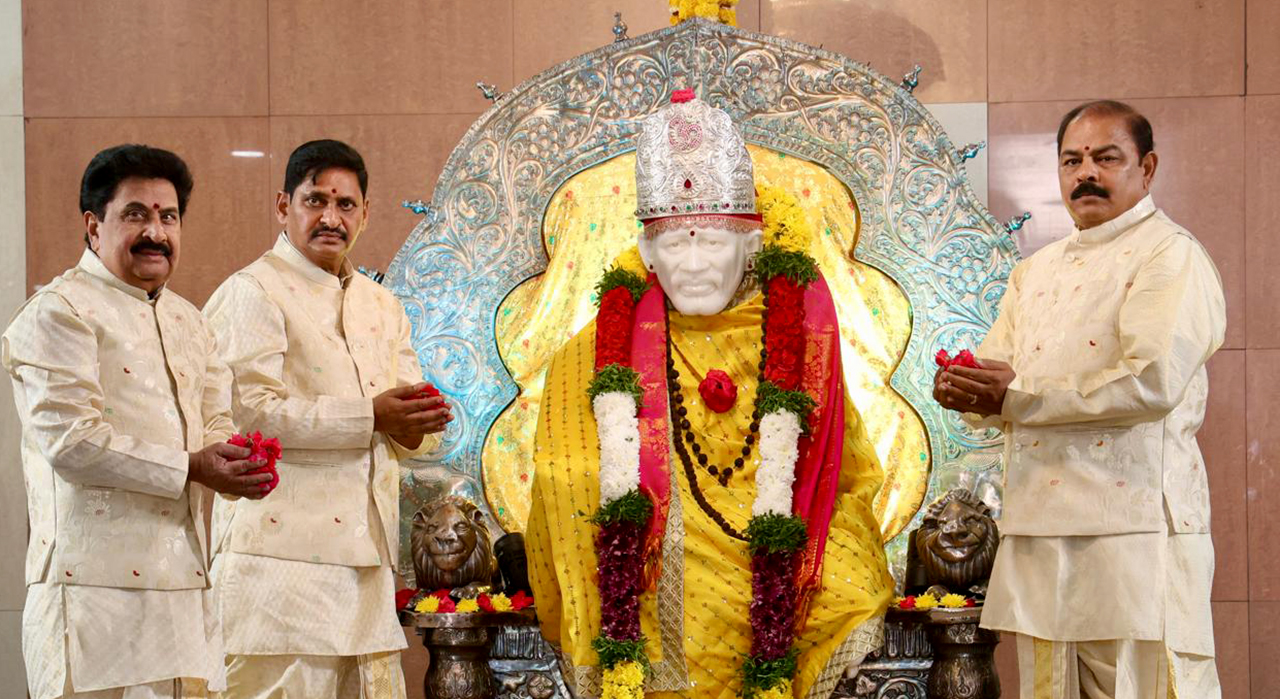 Former MLA, businessman, and head of KPR IT Educational Institutions, Kommoori Pratap Reddy has named his banner “Sai Pragathi Films.” He, along with director S.V. Krishna Reddy and presenter Achchi Reddy, visited the temple in traditional attire and performed special पूजा rituals before unveiling the banner. Photos of the trio in traditional dress at the temple, seeking blessings from their presiding deity Sai Baba, are currently going viral on Facebook and WhatsApp groups.