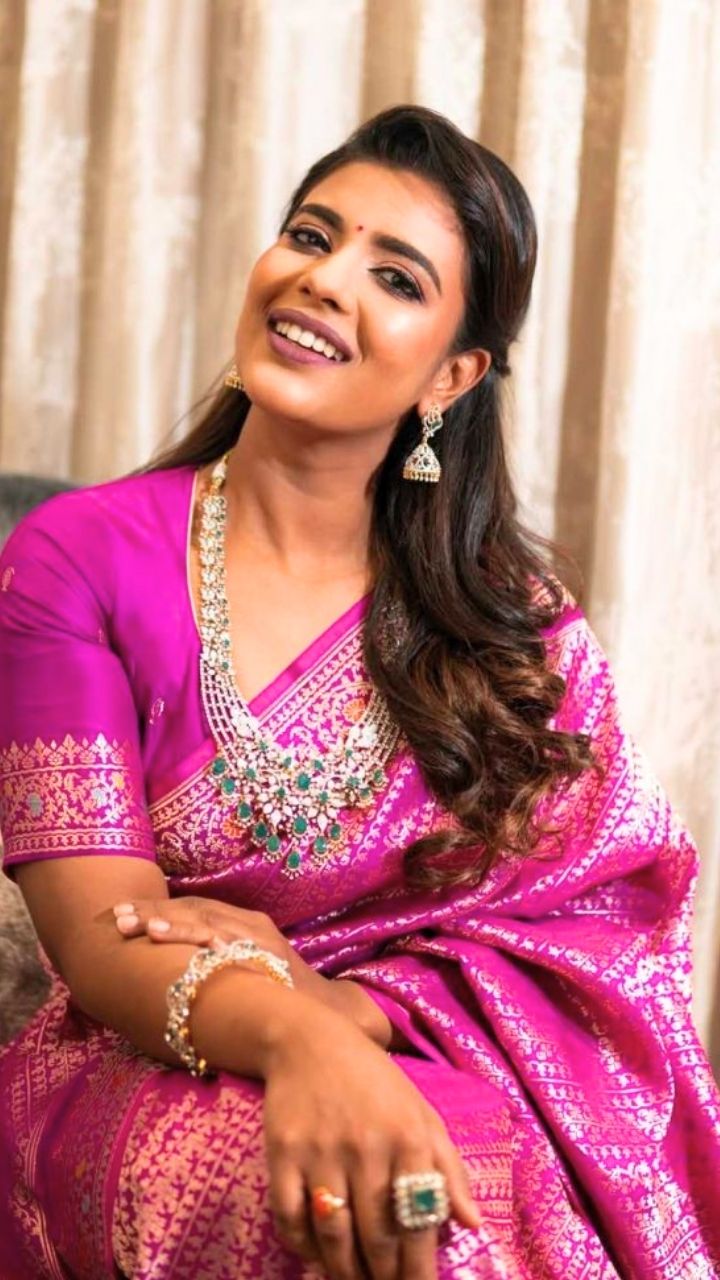 Actress Aishwarya Rajesh looks breathtaking in a stunning pink silk saree, blending tradition with glamour.