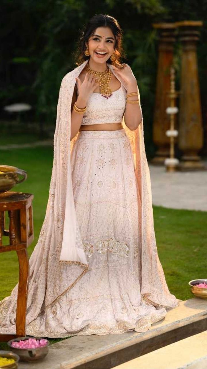Anupama Parameswaran looks breathtaking in a pastel embroidered lehenga, radiating grace and charm. Her joyful smile steals the spotlight instantly.