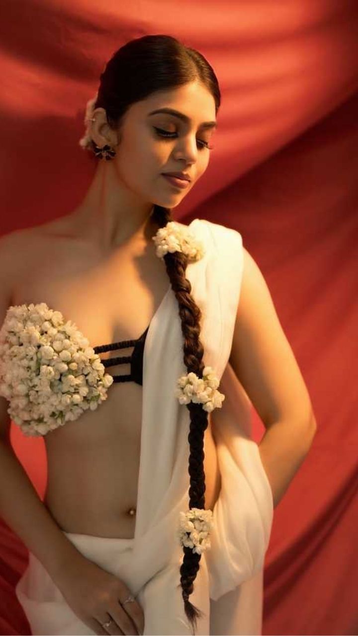 Timeless Beauty Bandhavi captivates in a soft white drape paired with delicate floral styling 🌼 Minimal yet mesmerizing!