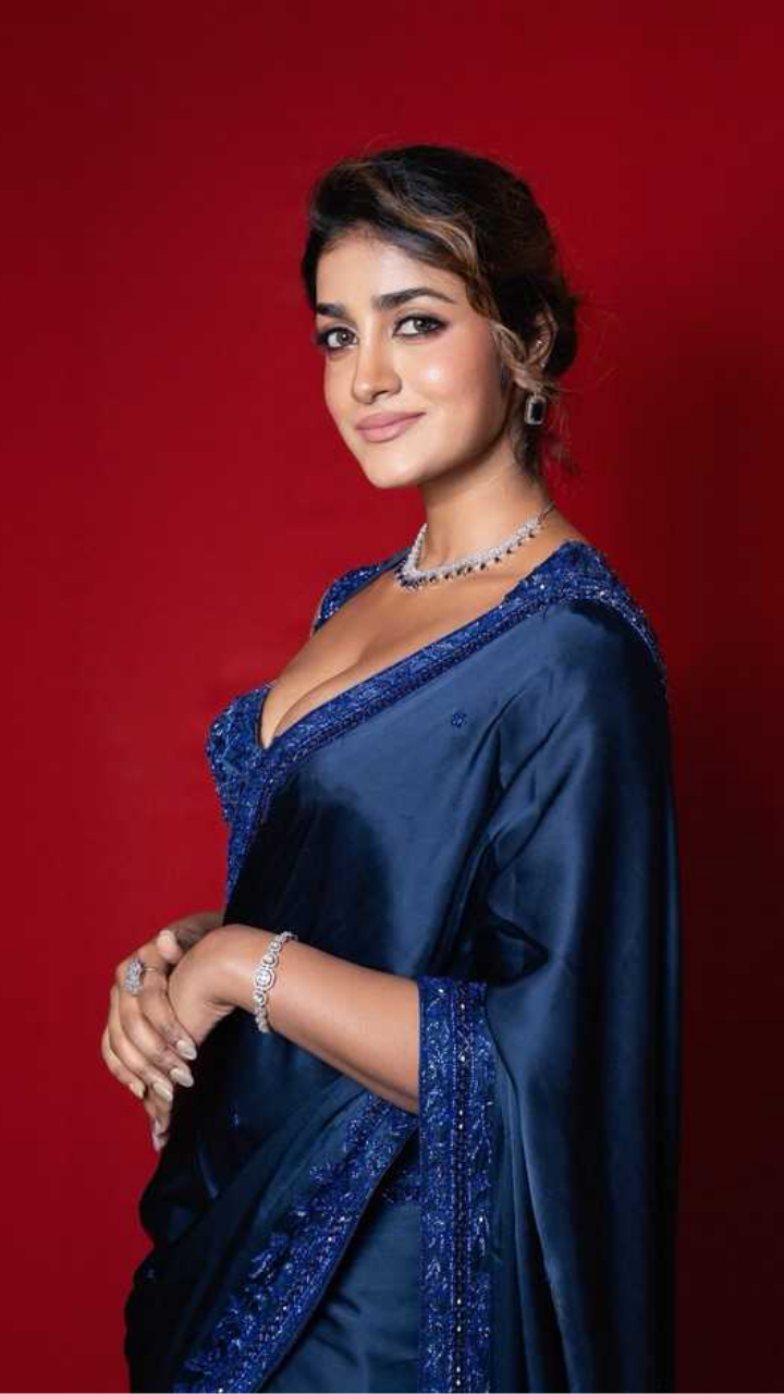 Draped in a stunning deep-blue saree, Dimple Hayathi redefines elegance with every pose.