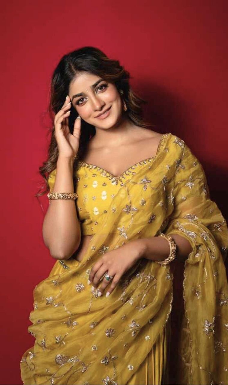 Grace Meets Glam Dimple Hayathi looks absolutely radiant in this stunning yellow saree, redefining ethnic elegance.