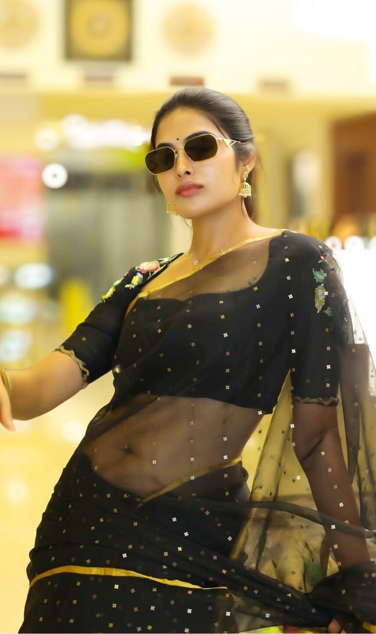 Actress Divi Vadthya stuns in a gorgeous black saree with golden detailing and sheer elegance.