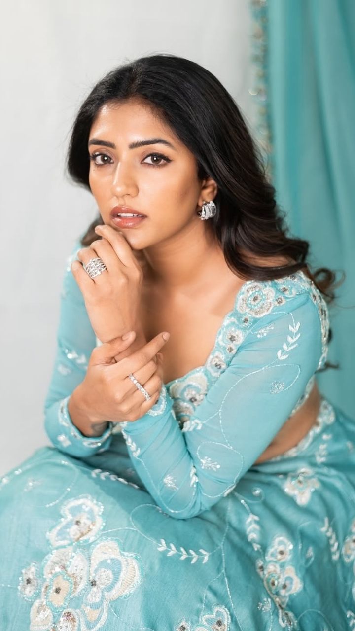 Dressed in a pastel blue embellished outfit, she radiates elegance with every pose.
