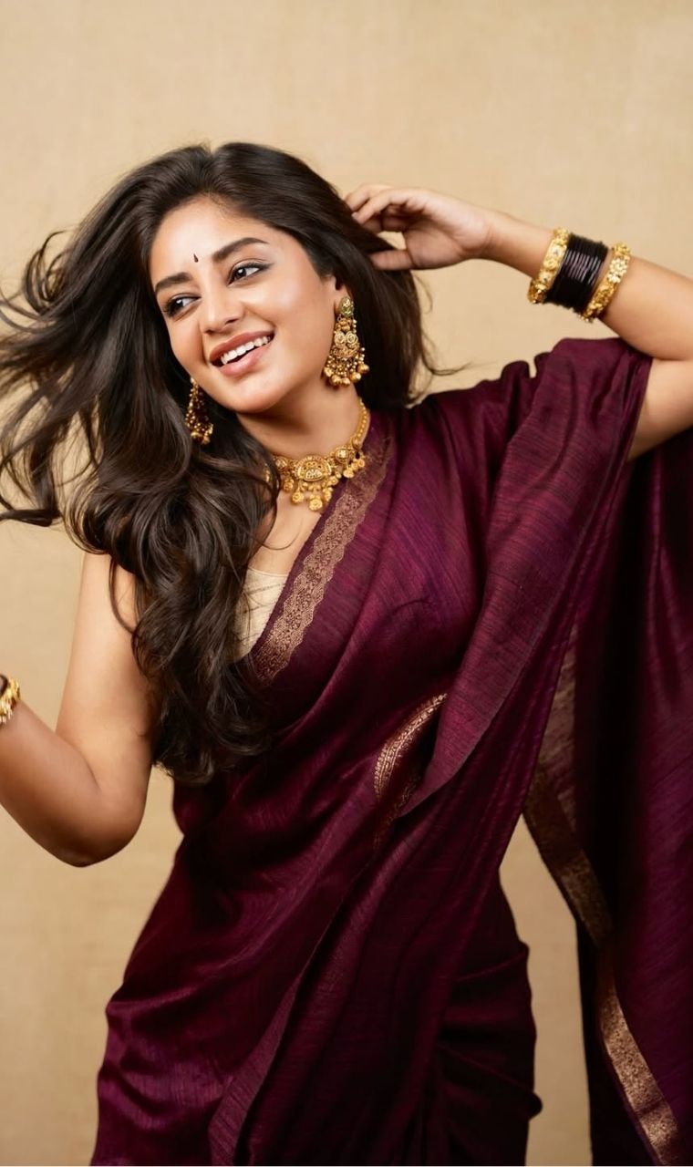 Deepshikha stuns in a maroon silk saree, radiating timeless beauty and elegance.
