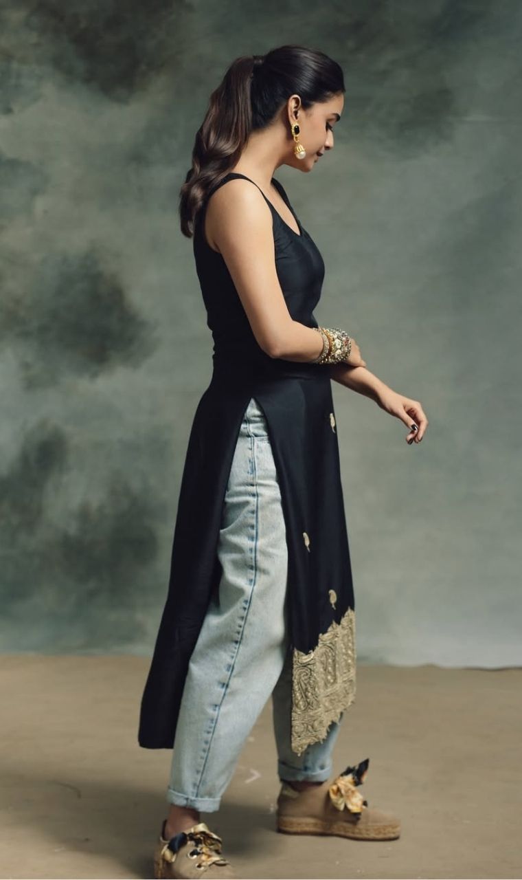 Keerthy pairs a sleek black kurta with embellished bottoms, creating the perfect blend of modern and traditional fashion.