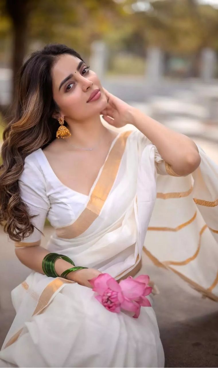 Actress Kushita Kallapu stuns in a traditional white and gold Kerala saree