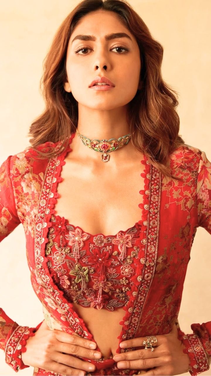The ever-gorgeous Mrunal Thakur stuns in a vibrant red floral outfit.