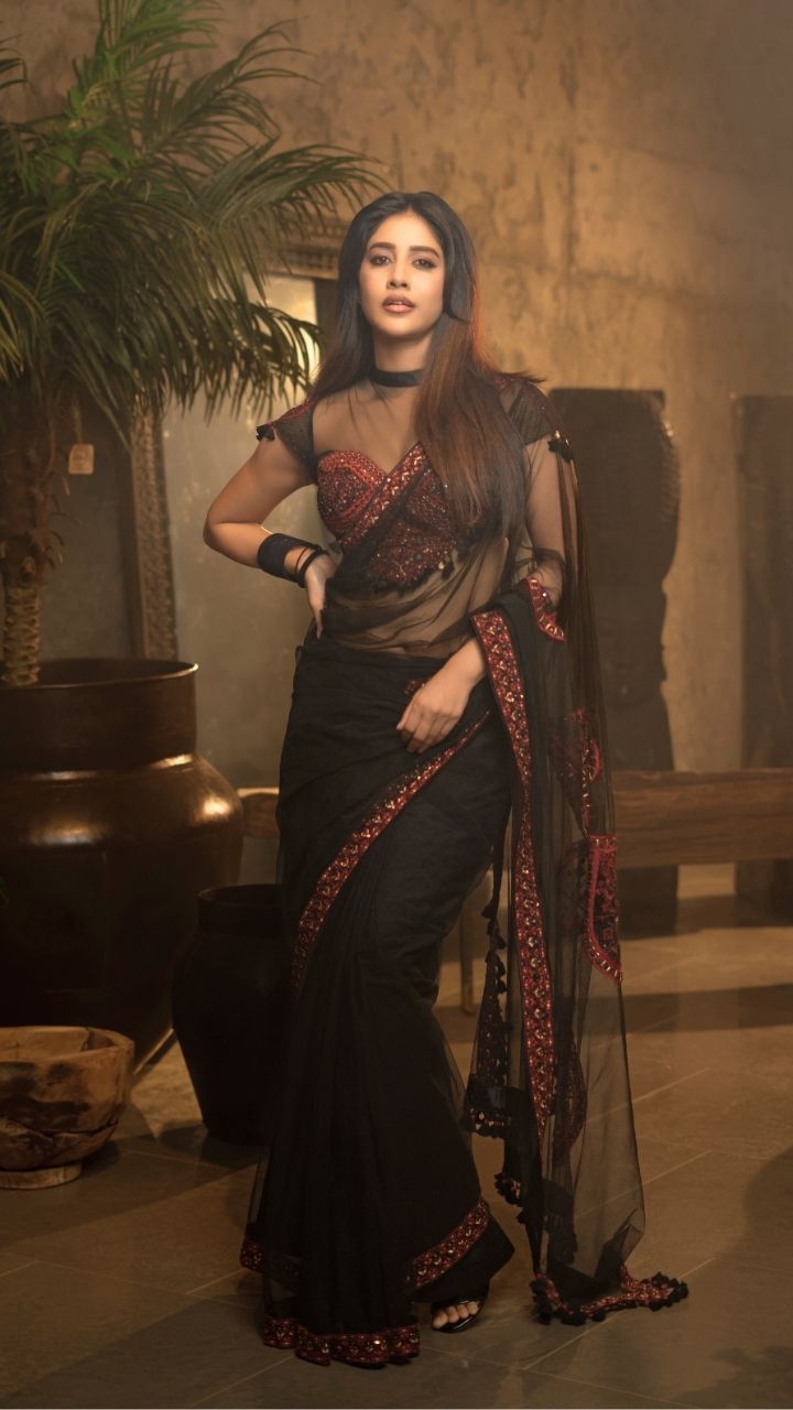 Bold & Beautiful 🖤 She dazzles in a sheer black saree paired with a heavily embellished red blouse.
