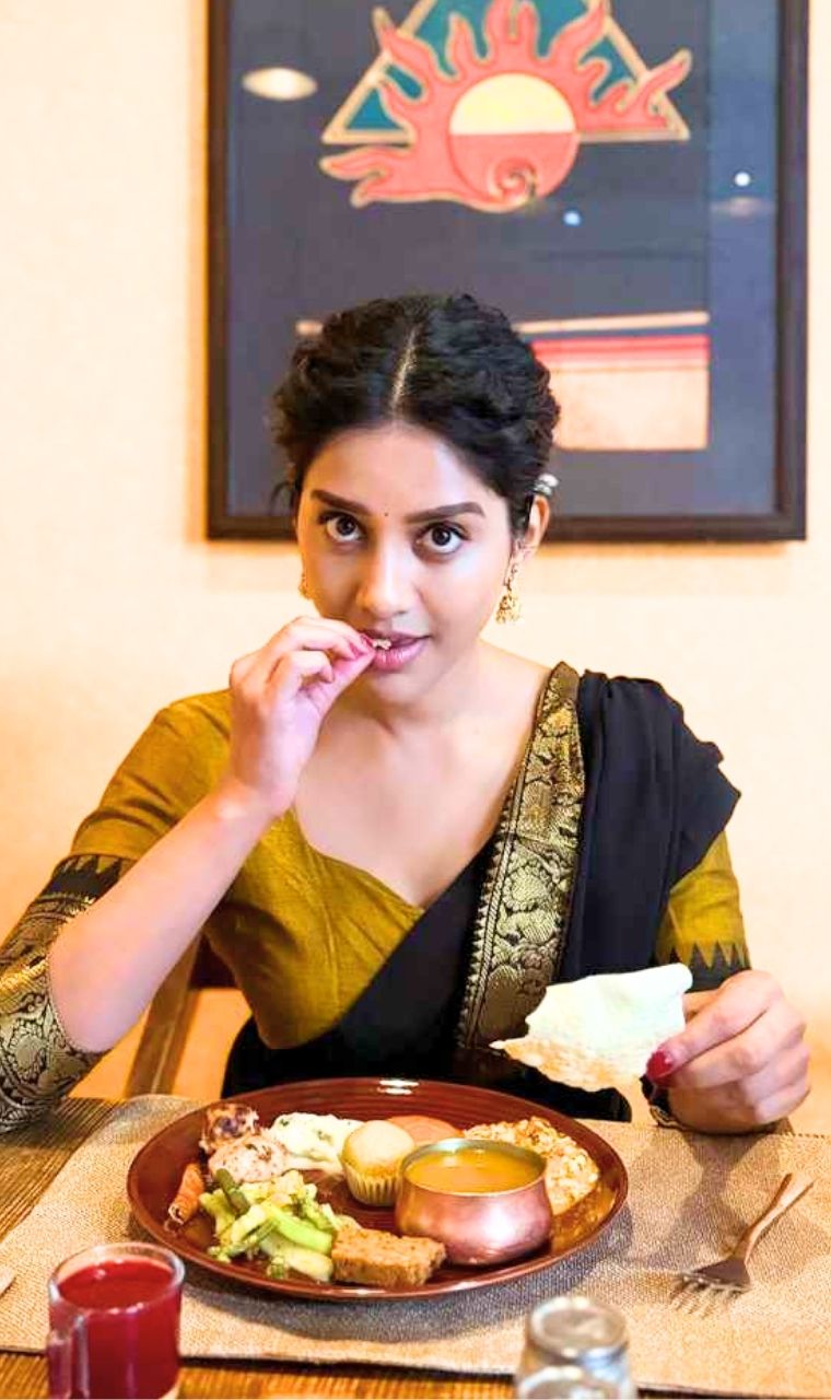 Traditional Elegance Nabha Natesh stuns in a classic black saree paired with a golden blouse, blending simplicity with royal elegance.