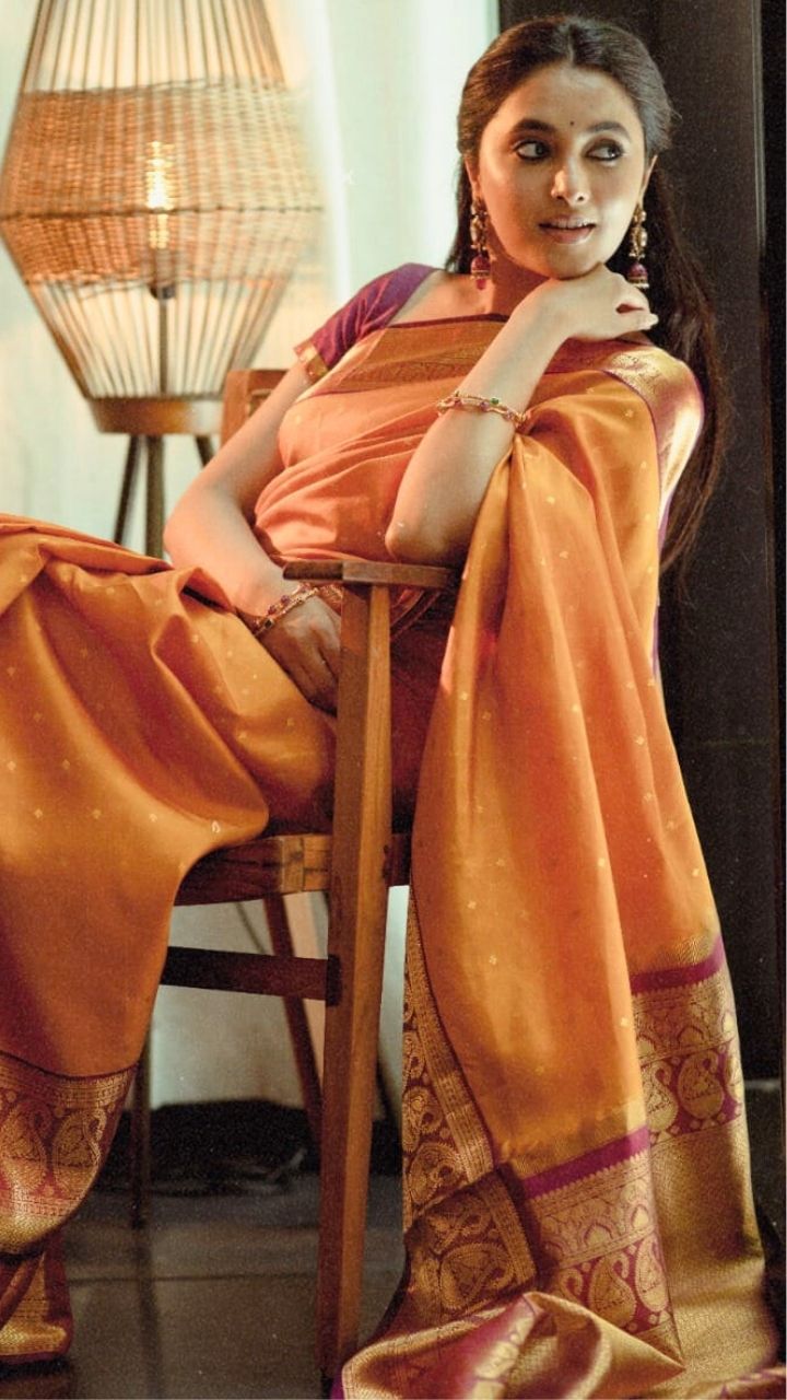 Draped in a rich orange silk saree with intricate golden zari detailing.