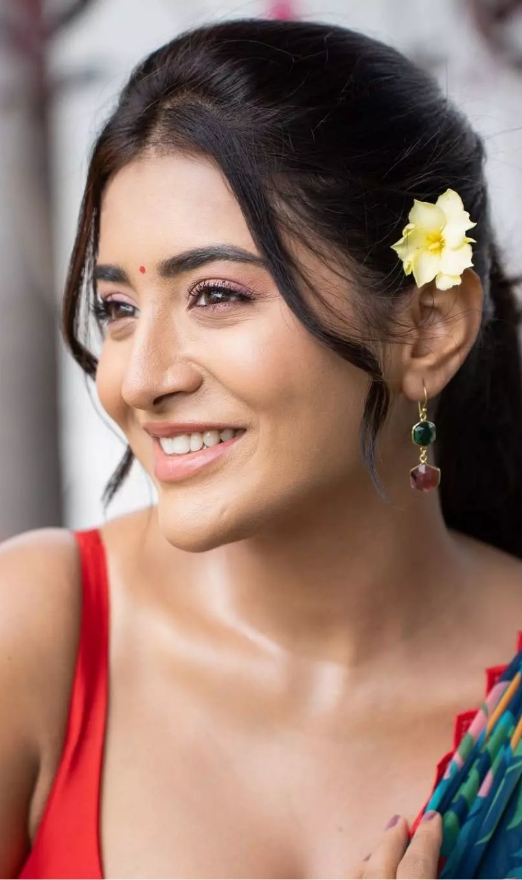 Draped in a colorful saree with a vibrant red blouse, she looks effortlessly stunning.