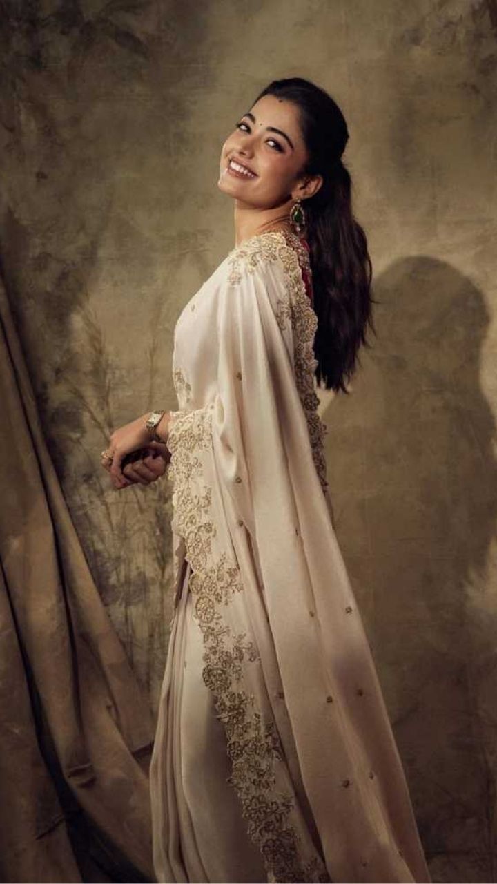Classic Beauty Draped in an ivory saree with intricate gold embroidery, Rashmika radiates pure sophistication.
