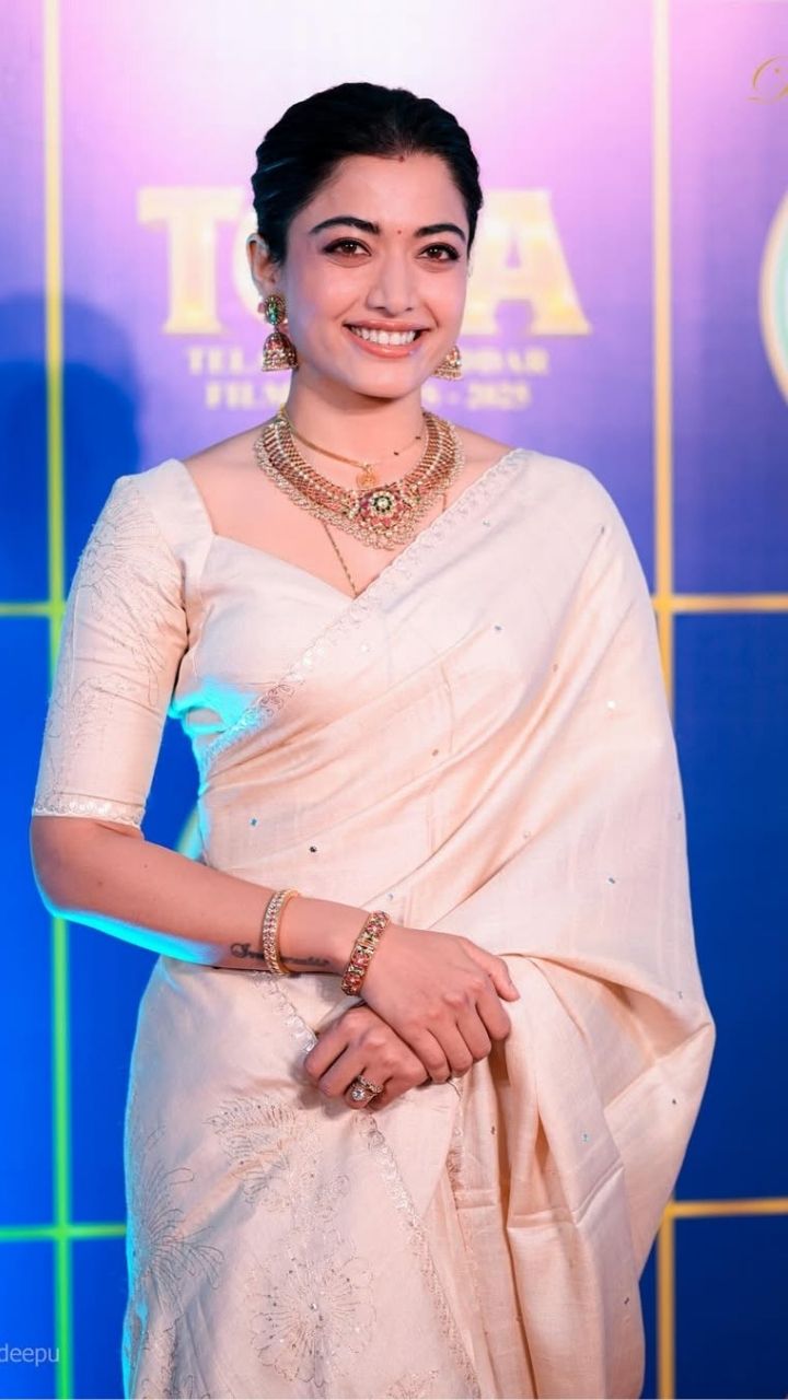 Draped in a soft ivory saree 🤍 Rashmika redefines simplicity with pure elegance.