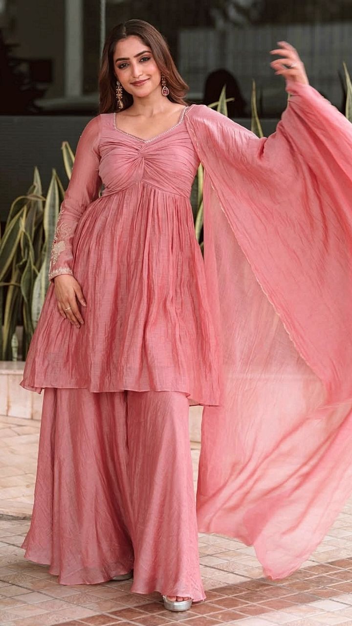 The flowy, layered kurta paired with wide-leg bottoms adds a dreamy silhouette that moves beautifully with every step.