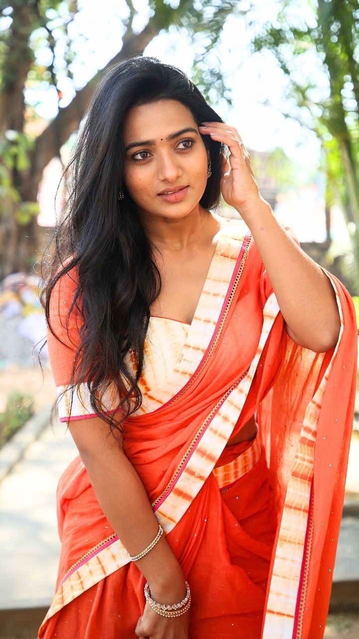 Radiating natural beauty in a vibrant orange saree.