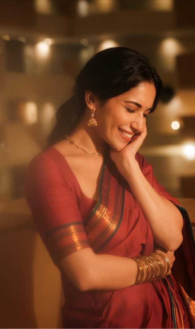 An Ethnic Statement The drape, the details, the demeanor — everything blends into a picture of grace. Her accessories and posture reflect a refined traditional aesthetic.