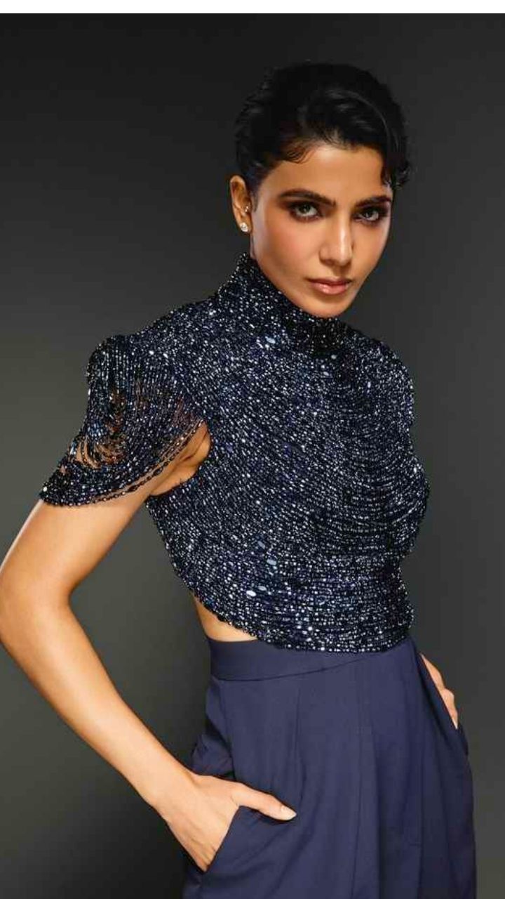 💙 Midnight Blue, Maximum Impact Samantha stuns in a shimmering high-neck ensemble that screams elegance.
