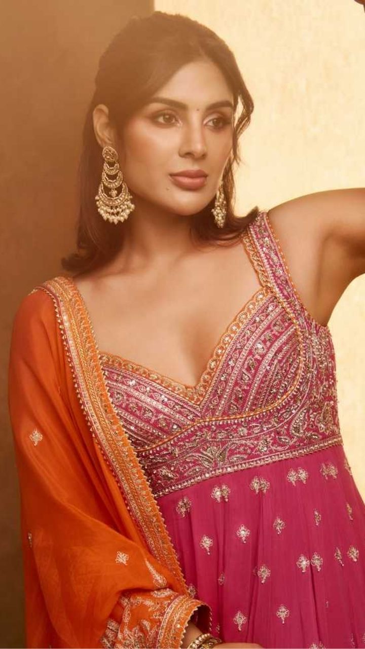 Draped in a vibrant pink lehenga, Samyuktha radiates timeless beauty with intricate embroidery and rich textures.