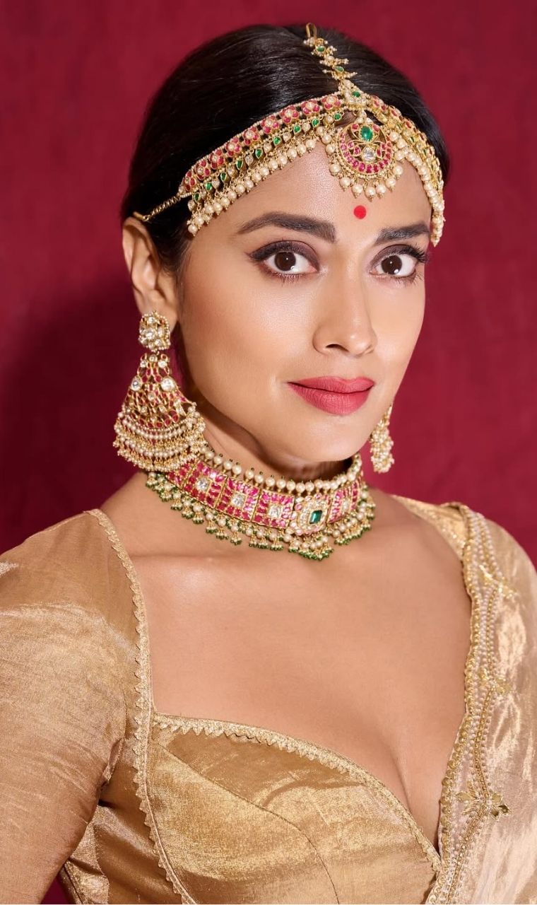 Shriya elevates her look with an exquisite choker, maang tikka, and jhumkas. Visual: Focus on her jewelry.