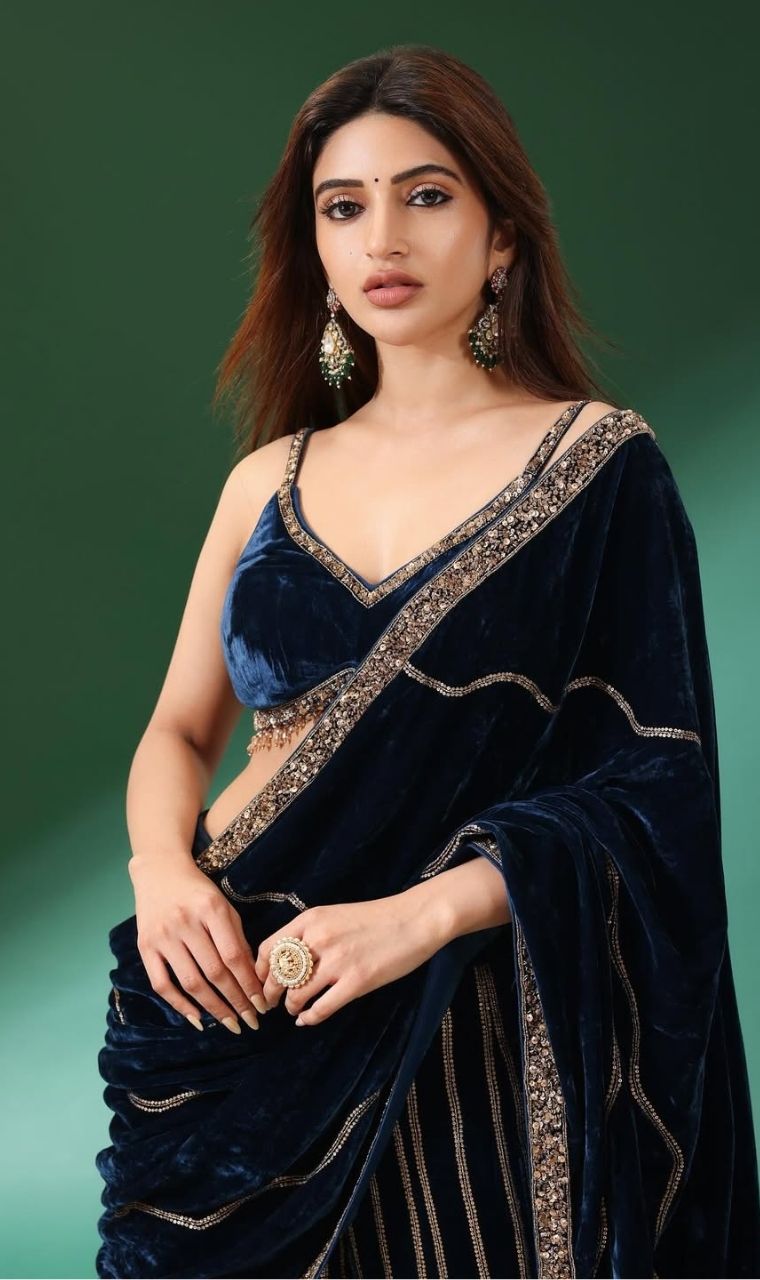 Sreeleela shines in royal elegance! The young star dazzles in a midnight blue velvet saree, redefining ethnic glam.