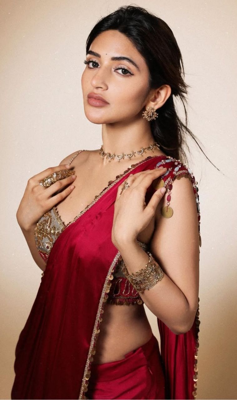 Red Saree, Royal Aura The rich maroon drape blends sophistication with festive charm.