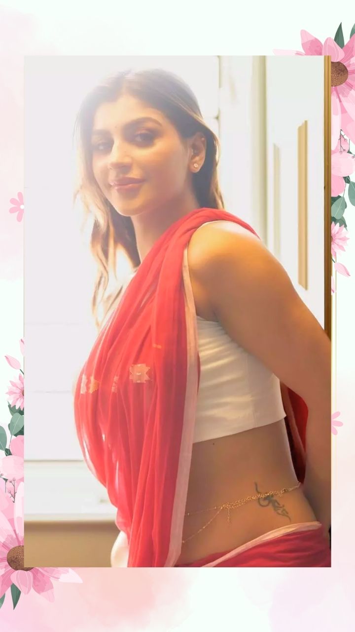 Yashika Aannand stuns in a traditional red saree paired with a white blouse, radiating elegance and charm.